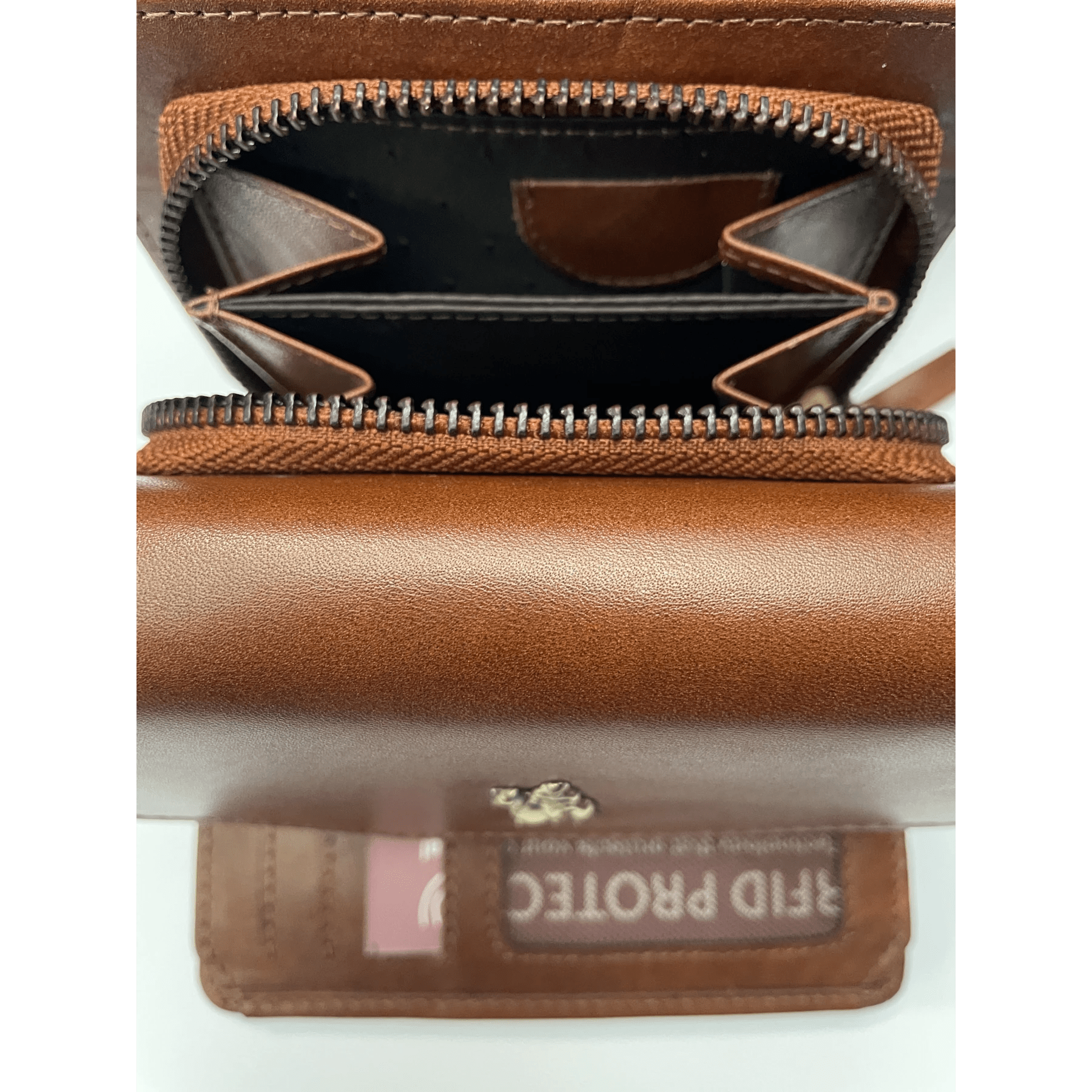 Soft leather with Multiple internal compartments, TC horseman metal logo, Snap front and back closure, Centre coin pocket with leather tab zip closure, 13 Card slots, including mesh ID holders, 3 note compartments, RFID PROTECT technology that protects your personal data and credit cards