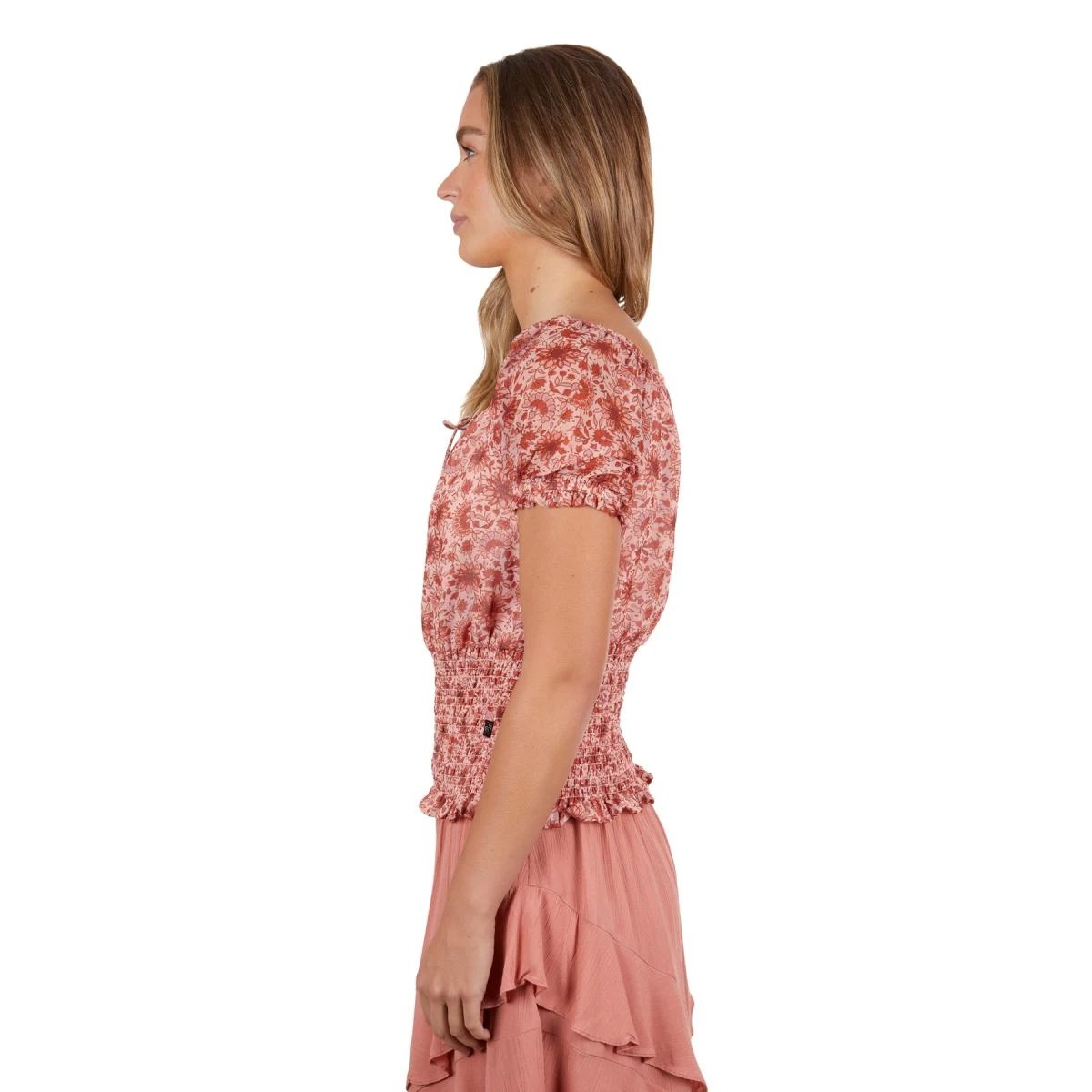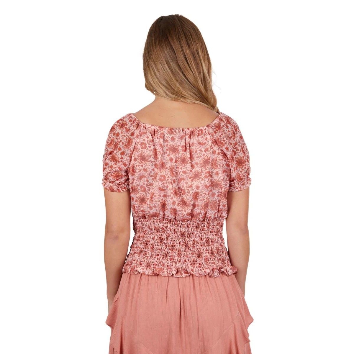 Short sleeve blouse with v-neck, front tie and bead detail, Original hand drawn floral print, Lined bodice, Shirred detail at waistband, Elasticated sleeve cuffs and neckline, Pure Western logo pip on side seam