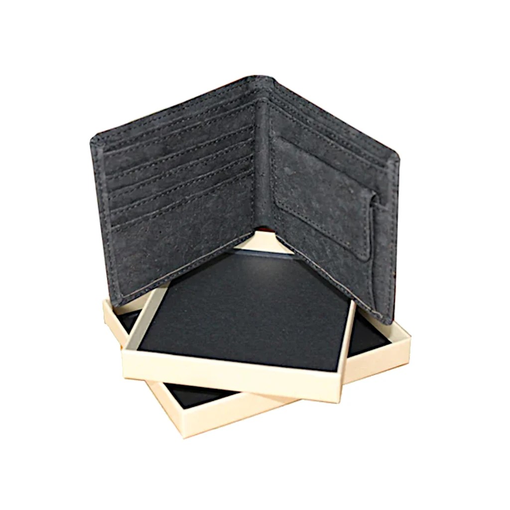 A trendy and stylish slimline wallet made from black cork with cotton backing