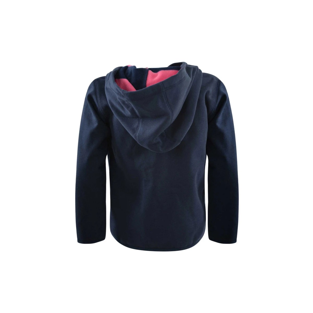 Water resistant technical bonded fabric, pink and navy stripe fleece lining, stretch nylon bound hem and pocket edges, horseman emblem at chest, front pockets, pink trim