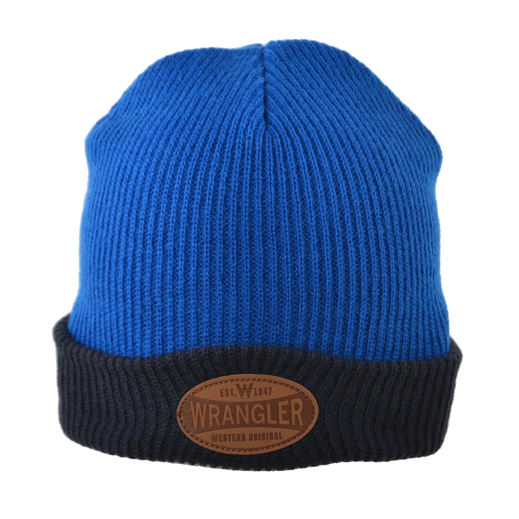 Two-tone knitted beanie with a Wrangler mock leather badge